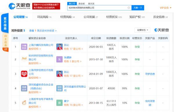 天眼查APP对外投资信息显示,杭州埃米网络科技有限公司持有杭州拼好货网络科技有限公司、上海寻梦信息技术有限公司100%股份。
