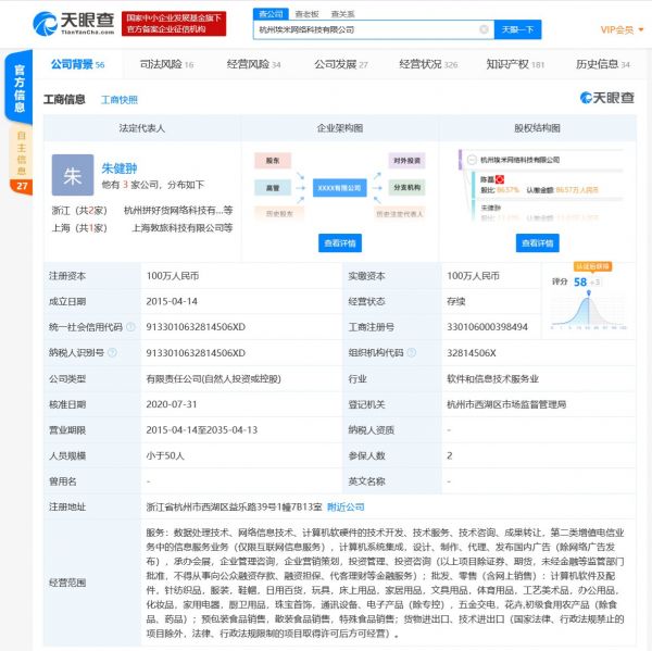 杭州埃米网络科技有限公司成立于2015年4月,注册资本100万人民币,公司经营范围包括服务:数据处理技术、网络信息技术、计算机软硬件的技术开发、技术服务、技术咨询、成果转让,第二类增值电信业务中的信息服务业务(仅限互联网信息服务)等。