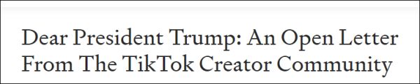 8月2日,9名TikTok知名博主,其粉丝数加起来超5400万人,他们联名在美国自媒体平台Medium上发表了一封致特朗普的公开信。