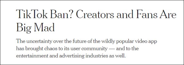 《纽约时报》报道称,当地时间8月2日,9名TikTok知名博主,其粉丝数加起来超5400万人,他们在美国自媒体平台Medium上发表了一封写给特朗普的公开信,称TikTok实现了脸书和INS等社交媒体永远无法实现的互动,呼吁要让资本来解决TikTok的问题,而不是国家干预。