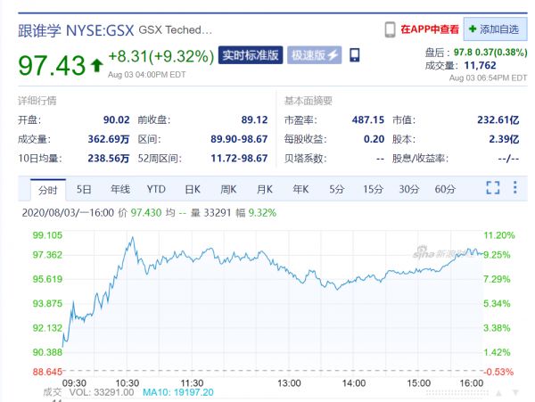 @新浪科技【跟谁学盘中股价创历史新高,市值超越新东方】8月3日晚,跟谁学(GSX.O)涨幅扩大至9%,盘中股价创历史新高,市值达232.14亿,超越新东方(EDU.N)的226.65亿美元。