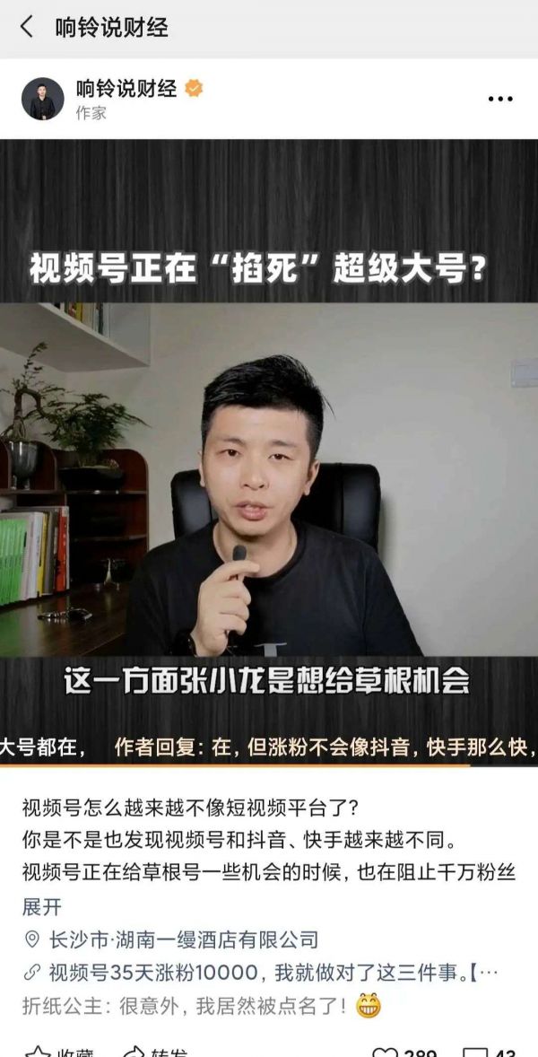 自媒体人曾响铃日前晒出截图,称视频号“响铃说财经”粉丝突破2万。他告诉剁椒娱投,其团队自2018年开始尝试做短视频,在历经爱奇艺、抖音、快手、小红书多个平台失败后,最终还是选择适合团队调性的视频号平台继续攻克短视频赛道。其粉丝增长路径为:视频号内容通过社群进行社交裂变,发红包请朋友点赞,进而撬动不同社交关系链。