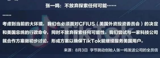 8月3日,字节跳动创始人张一鸣发送公司全员信,回应了外部关于tiktok美国业务的传言和猜测,,“我们不认同(出售TikTok北美业务这个)决定,因为一直以来我们都坚持确保用户数据安全、平台中立性和透明度。”