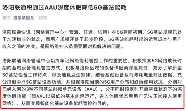 近日,洛阳联通发布了一则消息,主要内容是“AAU深度休眠降低5G基站能耗”,通俗来讲,就是5G基站在深夜时分这样的空闲时段,进入深度休眠的阶段,从而实现降低能耗的目标。