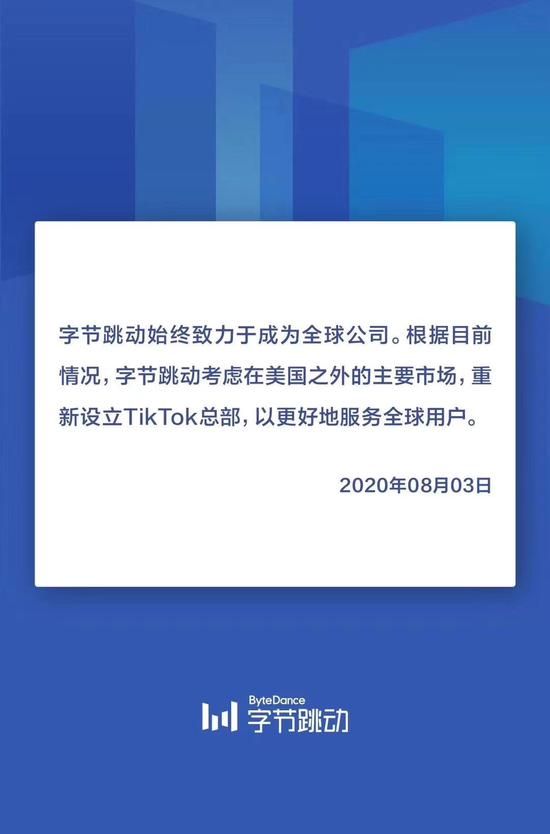 而字节跳动也于8月3日做出最新回应,称根据目前情况,字节跳动考虑在美国之外的主要市场,重新设立TikTok总部,以更好地服务全球用户。有媒体报道称,这一目的地可能是伦敦。