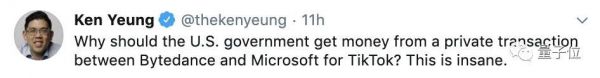 还有网友已经是一脸黑人问号:“为啥美国政府要从字节跳动和微软之间进行的私人交易里头拿钱?疯了吧。”