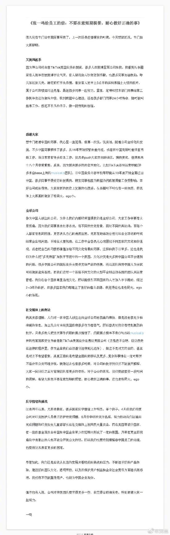 张一鸣再发全员信:对于公众的意见 我们要能接受一段时间的误解