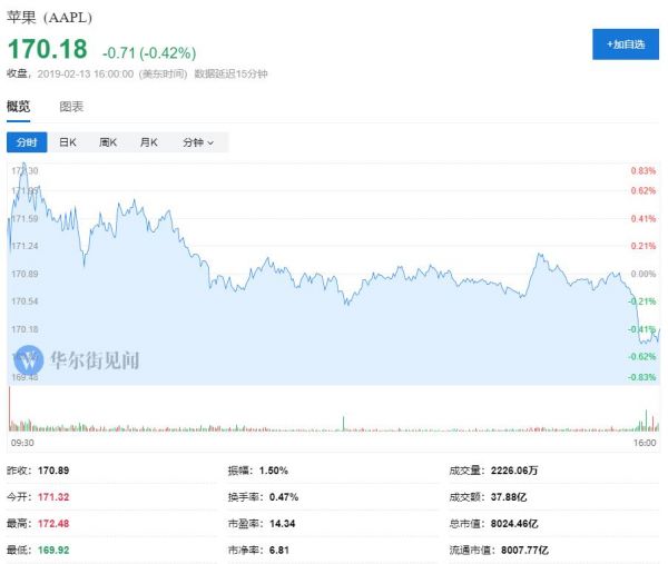 本周三,苹果股价高开低走,收跌0.42%,收报170.18美元。