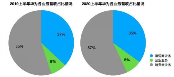 其中,2020年上半年,华为的运营商业务、企业业务、消费者业务分别收入1596亿人民币、363亿人民币、2558亿人民币,在2020上半年营收中分别占比35%、8%、57%。