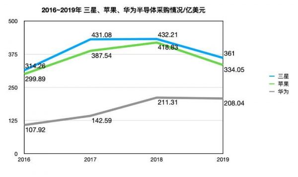 2016~2019年,华为、三星、苹果芯片采购支出