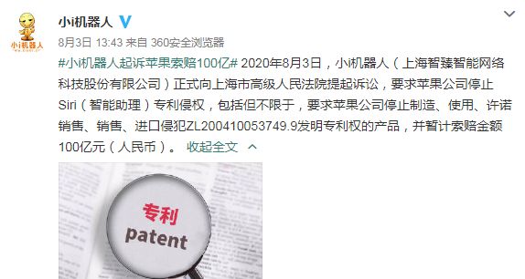 8月3日,小i机器人(上海智臻智能网络科技股份有限公司,简称上海智臻)正式向上海市高级人民法院提起诉讼,要求苹果公司停止Siri专利侵权,包括但不限于要求苹果公司停止制造、使用、许诺销售、销售、进口侵犯ZL200410053749.9发明专利权的产品,并暂计索赔金额100亿元人民币。