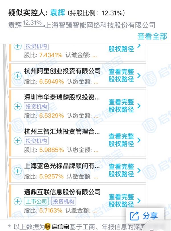 启信宝显示,小i机器人的股东中包括杭州阿里创业投资有限公司,持股6.59%;通鼎互联,持股5.7%;上海蓝色光标品牌顾问有限公司持股5.9%,其为蓝色光标100%间接持有;深圳市华泰瑞麟股权投资基金合伙企业(有限合伙)持股6.53%,其背后出资人包括伊利股份、通鼎互联、华孚时尚等。