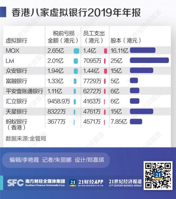 数据显示,八家虚拟银行在去年总共亏损超过11亿港元,其中,以渣打香港牵头成立的MOX Bank亏损最多,去年累计亏损2.65亿港元,员工支出高达1.4亿港元。其次为中银香港牵头成立的Livi,去年共亏损2.01亿港元;已经开业的众安银行(ZA bank)亦亏损近2亿港元。