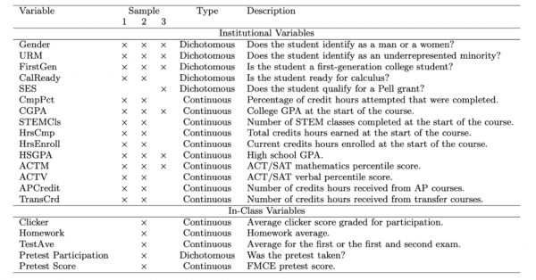 本研究中所使用的变量,都是来自大学和班级内部。同时,也将一些人口统计信息如性别、族裔等信息纳入其中。