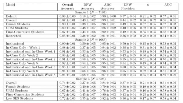 他们指出,在对整个样本预测结果中,女性和少数民族学生较多的样本,DFW 准确性较低,他们指出,这需要对人口统计学进行模型调整。