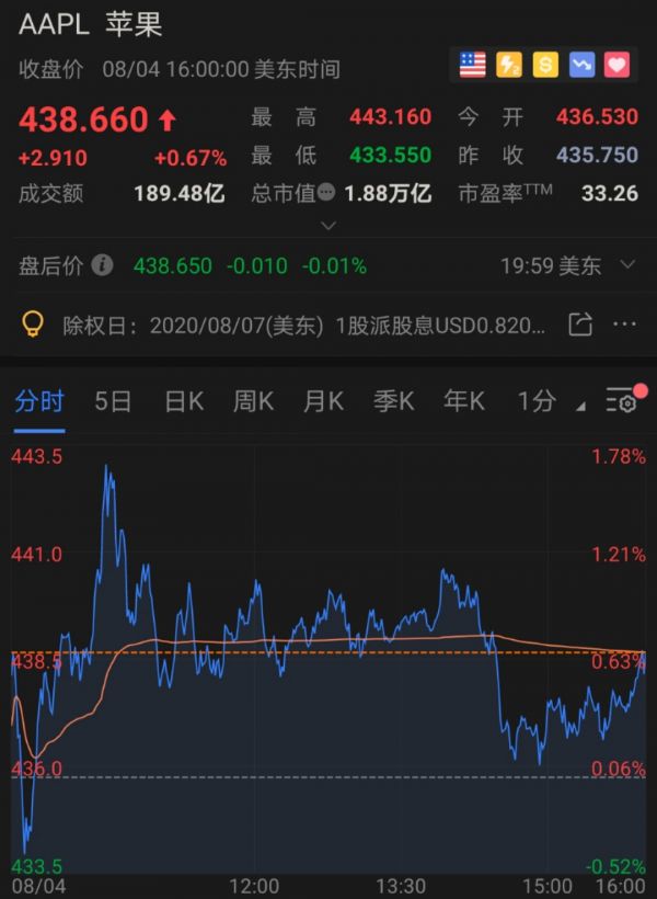 在苹果有意收购TikTok的消息传出后,周二美股早盘时段,苹果股价刷新日内新高,盘中涨幅一度达到1.7%,此后涨幅收窄到1%以内,但连续第三日创收盘新高,市值约1.88万亿美元。