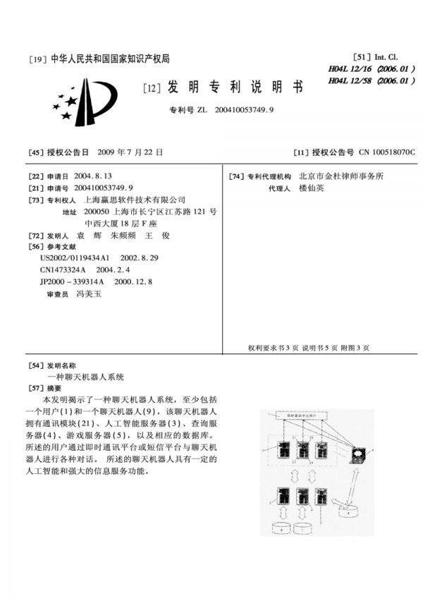 根据该项发明专利说明书的解释,小i机器人发明的聊天机器人系统拥有通讯模块、人工智能服务器、查询服务器、游戏服务器以及相应的数据库,所以这款聊天机器人具有一定的人工智能和强大的信息服务功能。与此同时,用户可以通过即时通讯平台或短信平台与聊天机器人进行各种对话。