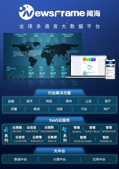 “闻海”大数据平台则是提供覆盖全球多维深度分析的媒体大数据服务。平台基于42个语种的海量媒体大数据,利用NLP深度语义模型,通过搜索引擎、分析引擎和可视化组件,完成智能简报、传播效果评估、领域主题指数榜单、数据推送、知识图谱全网搜索等SaaS云服务,为金融、宣传、网信、等行业提供解决方案。