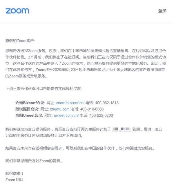声明称,此次服务转型将于 8 月 23 日生效,中国大陆用户届时可以通过授权的合作伙伴,以参与者的身份继续使用 Zoom 的视频会议服务。