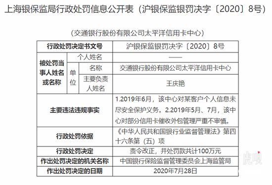 @新浪科技【交行信用卡中心被罚100万:对部分信用卡催收外包管理严重不审慎】8月5日下午,上海银保监局公布的行政处罚信息公开表显示,交通银行(4.780, -0.04, -0.83%)股份有限公司太平洋(4.270, -0.05, -1.16%)信用卡中心因对部分信用卡催收外包管理严重不审慎等两项违法违规行为,被责令改正并处罚款共计100万元。
