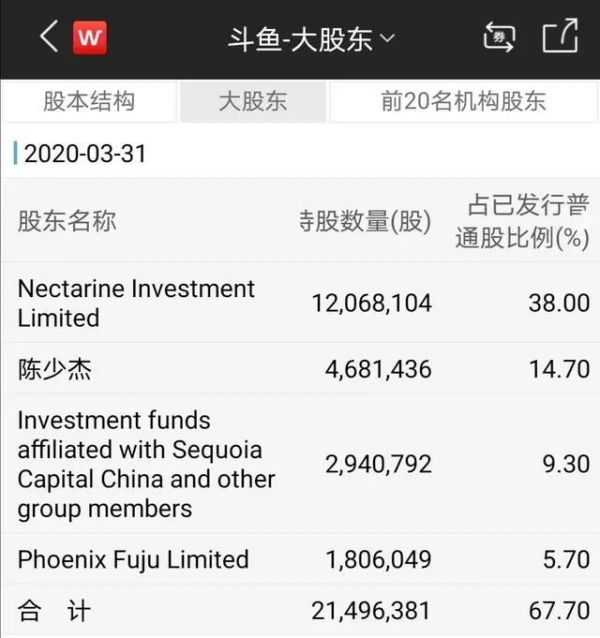 公开资料显示,斗鱼成立于2015年,腾讯分别参与了其B轮、C轮、E轮融资。截至2020年3月31日,腾讯全资子公司Nectarine Investment Limited持有斗鱼38%的股权,为斗鱼的第一大股东。