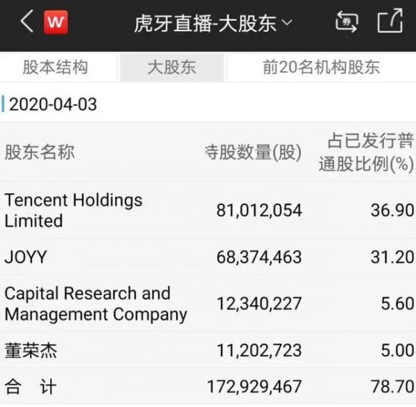 虎牙则成立于2016年,腾讯为其B轮阶段股东,截至2020年4月3日,腾讯持有虎牙36.9%的股权,同样为其第一大股东。