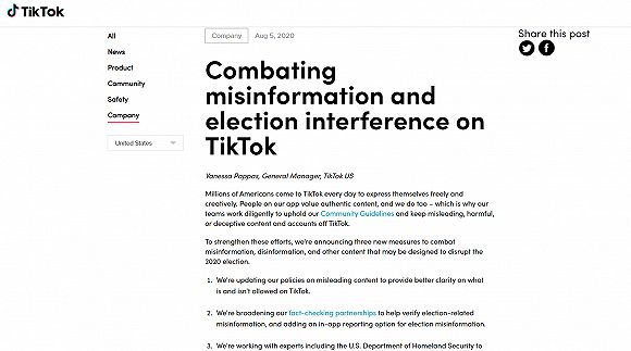 博文内容显示,TikTok将更新有关误导性内容的政策,以更明确地澄清TikTok平台上允许和不允许发布的内容。