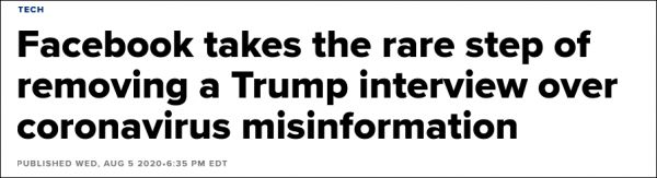 脸书罕见地删除特朗普贴文 称其违规发布涉疫情虚假信息