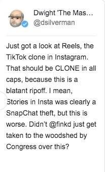 “Reels就是TikTok在Instagram的一个克隆产品。“