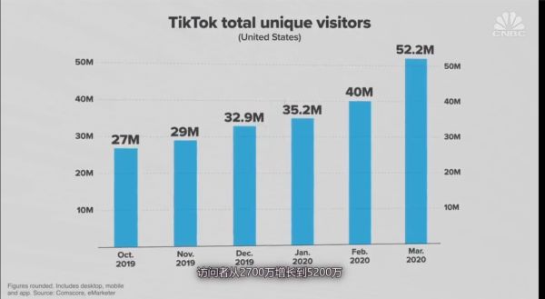在美国总用户数上,Instagram目前是1.1亿,Snap Chat 是8500万,TikTok是5200万。按当前TikTok的增长速度,在今年内用户数上超过这两家非常有可能。