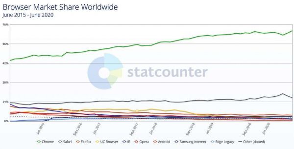 据StatCounter公司针对网页使用量的分析,在过去5年,谷歌Chrome浏览器在进一步巩固其在浏览器使用量方面的主导地位。除此之外,只有苹果Safari浏览器保持着基本稳定的地位。