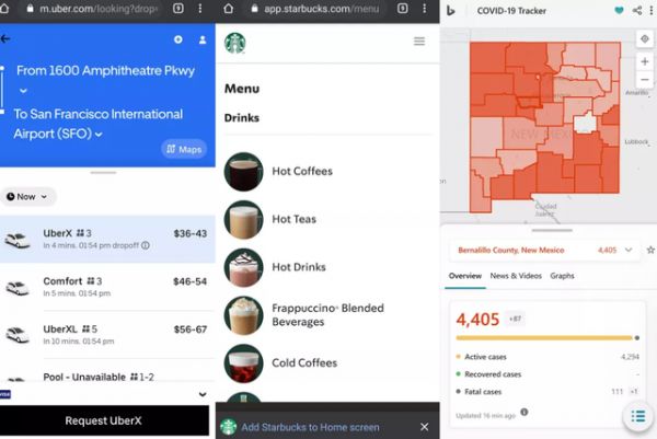 Uber、星巴克和必应提供的PWA服务。图片来源:Stephen Shankland/CNET