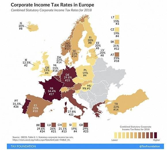 在过去的30年里,欧洲企业基础税率最低的头衔始终由英国不起眼的小邻居爱尔兰把持。爱尔兰目前12.5%的企业基础税率远低于英国的19%。