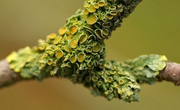 生长在树枝上的地衣。地衣是一种复合生物,由长在菌丝内的光合藻类或蓝细菌组成。但是,这种伙伴关系太紧密太独特了,以至于就像一个单一的有机体一样。