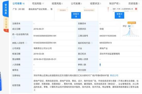 不仅如此,中国科技新闻网注意到,天眼查显示,上述微博用户披露的就职单位——德佑房地产经纪有限公司深圳分公司成立于2016年6月,参保人员为0。