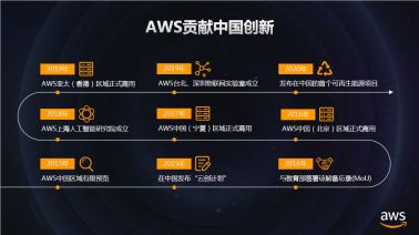 回顾一下 AWS 在中国的历史,会发现从 2013 年出中国版本预览,2015 年的云创,中间有两个非常重要的大事件,那就是 2016 年在北京区域正式商用,2017 年宁夏区域正式商用,2018年 AI Lab 在上海成立,以及 2019 年在香港区域投入使用。同时,2019 年台北和深圳物联网实验室成立,到 2020 年在中国投资再生能源的项目也落地。