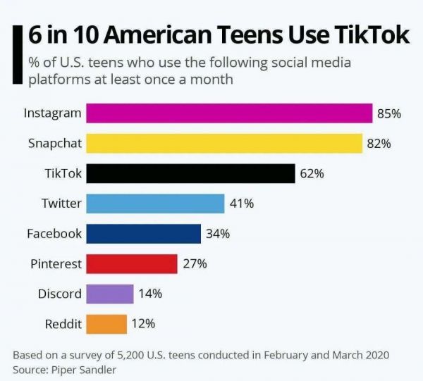 在美国青少年中,每10个人中就有6个使用TikTok,排在第三位,前两位分别是Instagram和Snapchat。