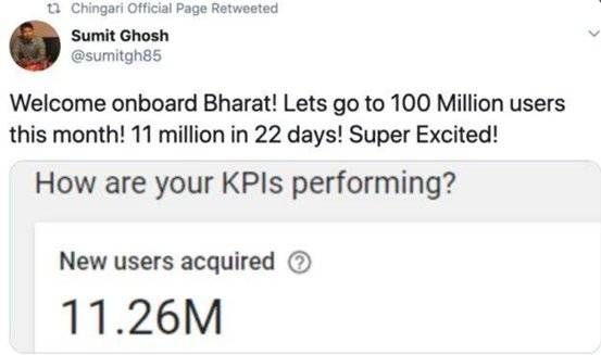 Chingari 创始人之一 Sumit Ghosh 更是不要脸地发了一个消息:“这个月让我们拥有 1 亿用户!22 天内达到 1100 万!超激动啊!”。