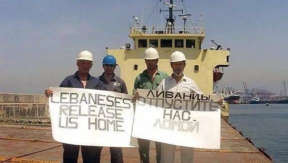 船员手持“黎巴嫩释放我们回家”标语。图片来源:Twitter