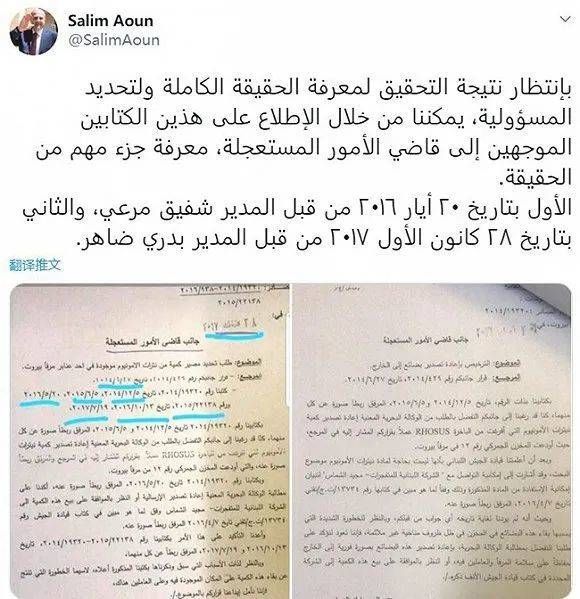 黎巴嫩人权活动人士获得的档案显示,从2014年到2017年,黎巴嫩海关总署历任署长先后向司法部门发出六封信件,警告这批硝酸铵的危险。