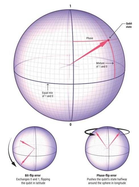 这个相位角度可以从0°到360°之间变化,它是波动干涉效应的关键,而正是这种量子干涉赋予了量子计算机超强的能力。原理上,任何量子比特态的错误可以被认为是比特翻转和相位翻转的某种组合,比特翻转对应0和1发生交换,而相位翻转对应于相位变化180度。