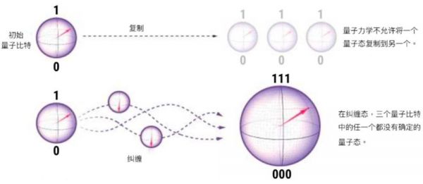 举例来说,如果初始的量子比特处于30%的0和70%的1的叠加态,我们可以将它与其他比特连成一个链,比如三个量子比特共享一个纠缠态,其中30%为全0,70%为全1。这个态与初始比特的三个拷贝构成的态是不同的。