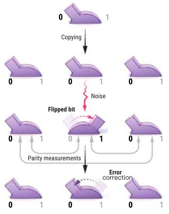 在传统计算机中,一个比特就是一个可以被设置为0或1的开关。为了保护一个比特,计算机可以将它复制到其他比特上。如果噪声引起某个拷贝发生了翻转,通过做奇偶校验,计算机就能定位到错误:将一对比特进行对比,看它们状态相同还是不同。