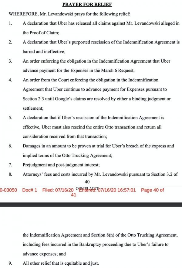 就此,勒万多斯基希望破产法庭能够判决 Uber 1. 支付破产案件中自己一方已经和将要产生的支出,2. 雇佣合同中赔偿条款的撤回失效,3. 支付总计41.28亿美元的赔偿金等。