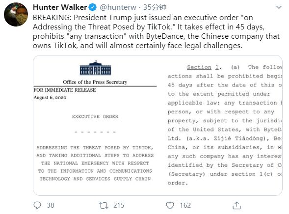 最前线 | 美国总统特朗普签署行政命令,将在45天内禁止与TikTok、WeChat的美国交易
