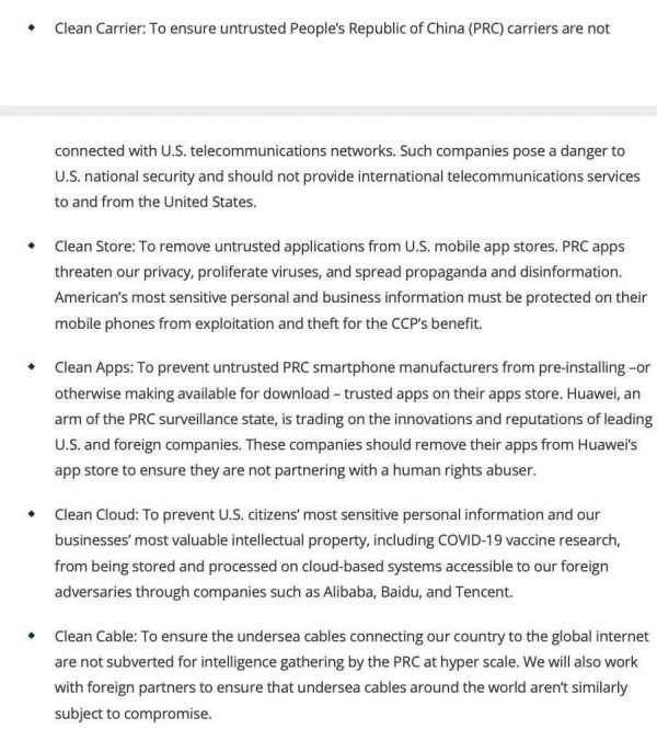其在发言中明确表示,当下以华为、阿里巴巴、百度、腾讯为首的中国企业正在威胁美国信息安全。因此,特朗普政府将扩大此前于4月29日发布的“净网计划” 以保护美国的资产与安全。