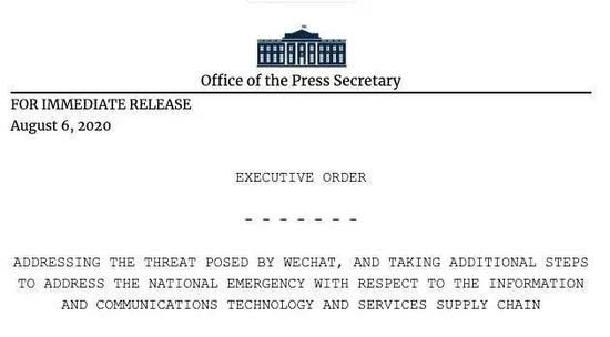 总统令:从生效日开始,所有美国公司与个人不得与微信、字节跳动进行交易