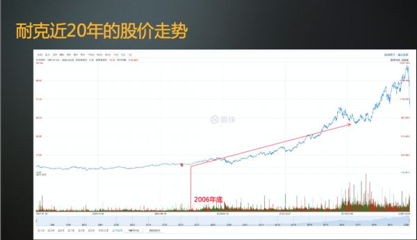 我们回看一下耐克的整个发展历史,从2006年以后到今天为止,它的整一个市值的走势,发生了一个大幅度的上涨,而在2006年以前他们持续了十几年的平稳发展,没有过太大的起伏。