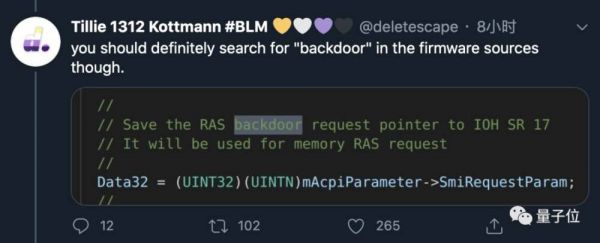 大家一直怀疑英特尔的CPU是否有后门,通过这次泄露事件得到了证实。获得这份文件的工程师用关键词“backdoor”搜索,发现英特尔居然将其赫然写在代码注释里。