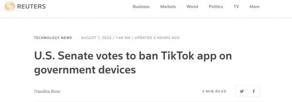 【环球网报道 记者 侯佳欣】美国围剿TikTok又有新动作。路透社6日消息称,当地时间8月6日,美国参议院投票通过一项法案,禁止联邦雇员在政府设备上使用TikTok。
